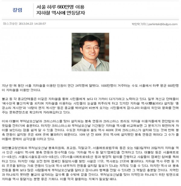 불교신문)서울 하루 660만명 이용, 지하철 역사에 연등달자