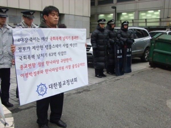 사단법인 대한불교청년회(회장 정우식)가 템플스테이 예산이 대폭 삭감된 내년도 국회 예산 통과와 관련 한나라당에 대해 규탄 성명을 내고 1인 시위에 돌입했다. 대한불교청년회는 지난 10일 발표한 성명에서 “민주주의의 기본질서를 파괴하고 날치기를 자행한 한나라당은 국민 앞에 머리숙여 사죄하라”며 “민족의 전통문화를 폄하하고 종교갈등을 조장하는 종교편향 정책을 즉각 중단하라”고 목소리를 높였다.