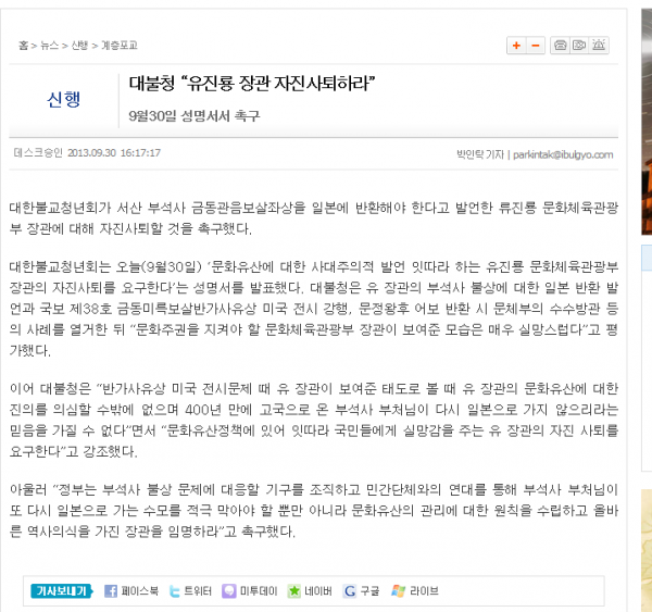 불교신문) 서산 부석사 금동관음보살좌상에 관련 성명서 발표 보도자료