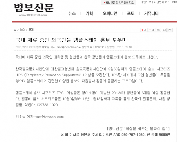 법보신문)TPS (Templestay Promotion Supporters) 보도자료