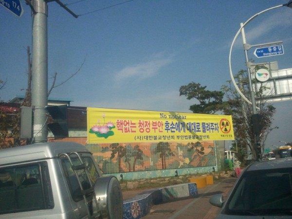 실행하고자 저희 부안법륜불교 청년회에서는 부안지역에 사진과 같이 고준위 핵폐기물 반대의사를 표명한 현수막을 게첨하였습니다