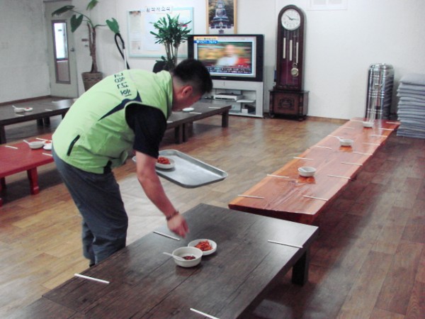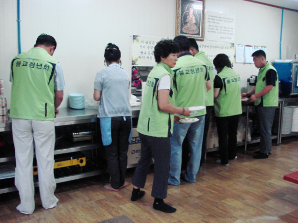 탁정열(대한불교청년회 26대 중앙 자문위원장)과 사모님 등 여러 법우님들께서 어르신들을 위해 정성스레 음식을 준비하고, 공양올리는 모습이 참 보기 좋습니다.