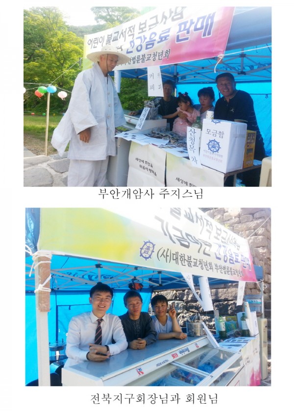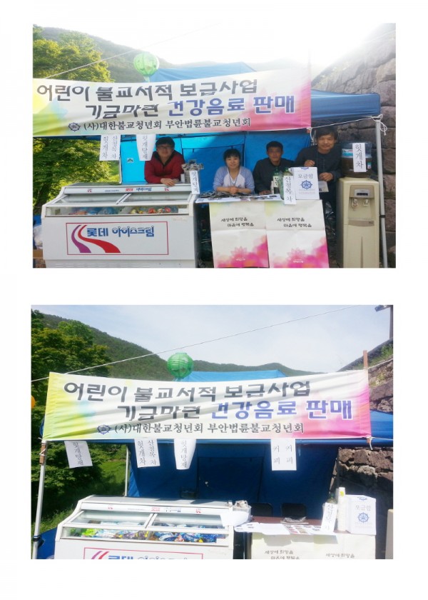부안법륜불교청년회에서 농어촌 시골학교에 기증 전달할 어린이 불교서적마련을 위해 부처님오신날과 그다음날까지 부안개암사에서 건강음료를 무료로 나누워주면서 기금마련을 위한 모금행사를 하였습니다 바쁘신가운데 저희회원님들께서 서로 조금씩 시간을 내주시어 동참해주셨습니다
