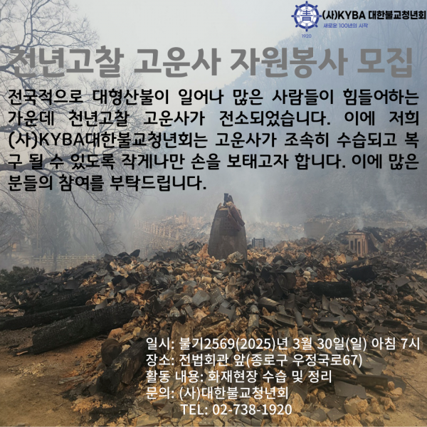 안녕하세요. 대한불교청년회 중앙 사무국입니다. 경북지역 산불화재로 인하여 천년고찰인 고운사가 전소되었습니다. 이에 작지만 저희의 손길을 보태고자 오는 3월 30일에 고운사로 봉사를 떠나려 합니다. 봉사에 참여하실 회원분들은 3월30일 일요일 아침 7시까지 전법회관 앞으로 와주시면 저희가 마련한 버스에 탑승하여 같이 출발하시면 됩니다. 회원 여러분들의 많은 참여 부탁드립니다.