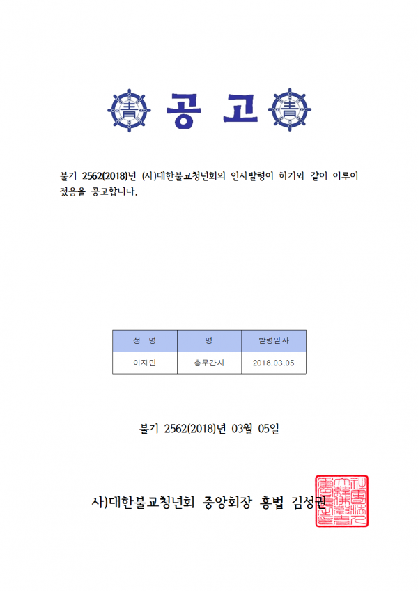 공고 불기 2562(2018)년 (사)대한불교청년회 인사발령