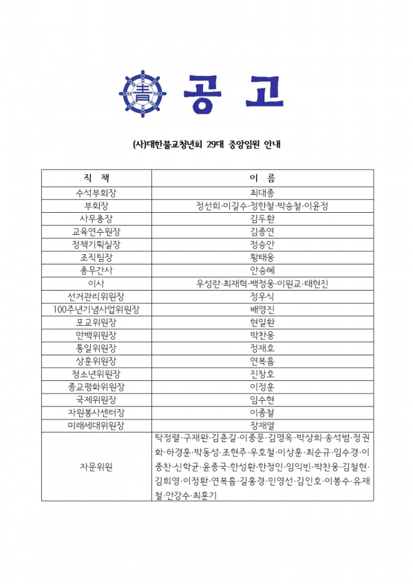 [공고] (사)대한불교청년회 29대 중앙임원 안내
