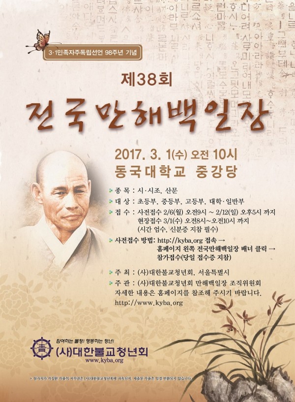 [공고] 제38회 전국 만해백일장 안내 페이지 정보 작성자 대한불교청년회 작성일17-02-06 09:02 조회6,268회 댓글0건 본문 댓글목록 등록된 댓글이 없습니다. 이전글 다음글 목록