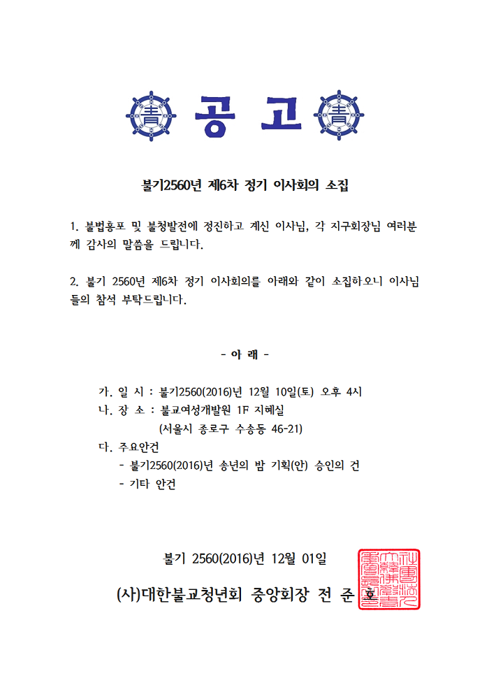 [공고] 불기2560(2016)년 제6차 정기 이사회의 소집