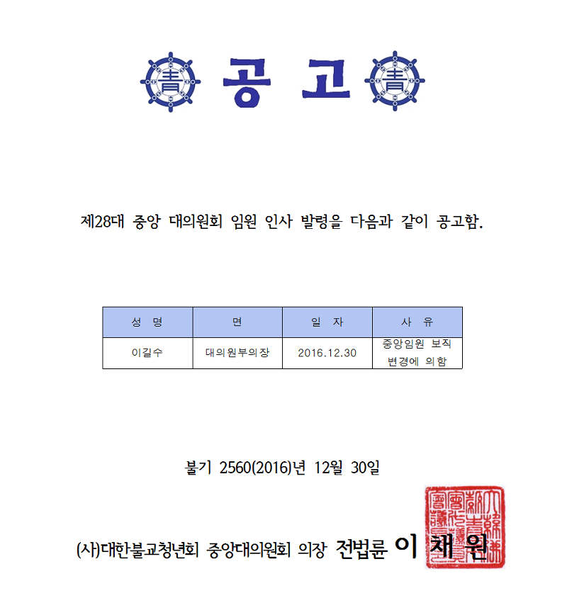 [공고] 중앙대의원회 임원 인사 발령 공고 페이지 정보 작성자 중앙대의원회 작성일16-12-30 11:30 조회5,287회 댓글0건 본문 댓글목록 등록된 댓글이 없습니다. 이전글 다음글 목록