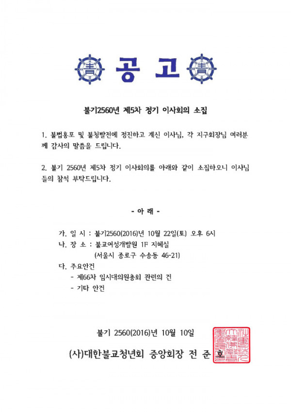 [공고] 불기2560(2016)년 제5차 정기 이사회의 소집