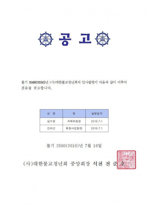 [공고] 불기2560(2016)년 중앙사무국 임원 인사 발령