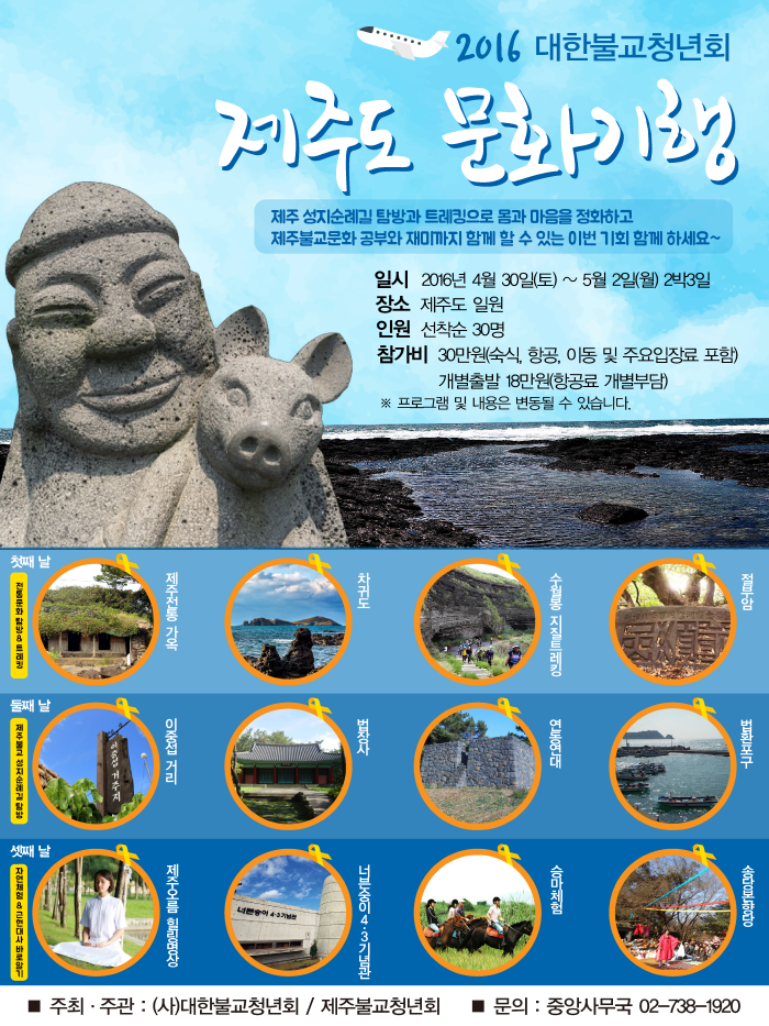 2016 대한불교청년회 제주도 문화기행 페이지 정보 작성자 대한불교청년회 작성일16-04-02 22:20 조회5,516회 댓글0건 본문 댓글목록 등록된 댓글이 없습니다. 이전글 다음글 목록