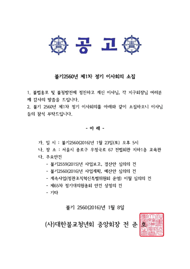 [공고] 불기2560(2016)년 제1차 정기 이사회의 소집