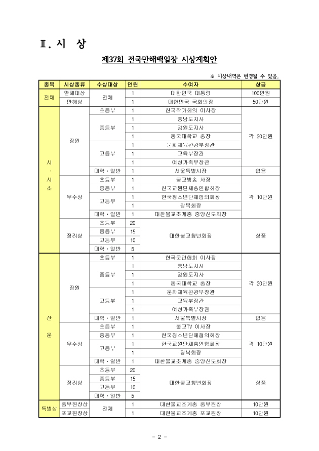 제37회 전국 만해백일장 사업계획안 페이지 정보 작성자 중앙사무국 작성일16-01-27 15:28 조회7,138회 댓글0건 본문 댓글목록 등록된 댓글이 없습니다. 이전글 다음글 목록