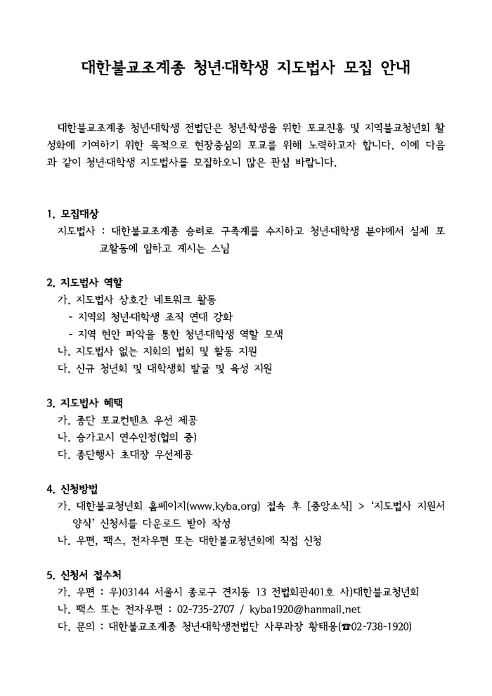 대한불교조계종 청년대학생 지도법사 모집 안내