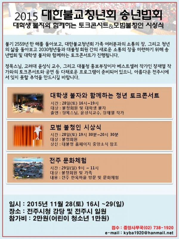 (03144) 서울특별시 우정국로 67 전법회관 401호 대한불교청년회T. 02)738-1920F. 02)735-2707E-mail. kyba1920@hanmail.net