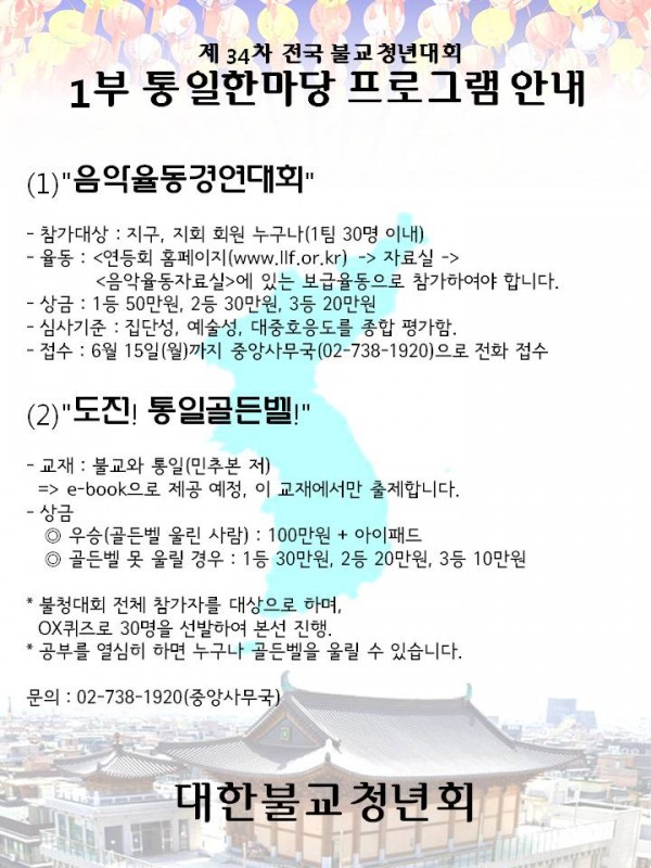 [공고]제34차 전국불교청년대회 프로그램 안내 페이지 정보 작성자 중앙사무국 작성일15-06-01 16:46 조회5,243회 댓글0건 본문 댓글목록 등록된 댓글이 없습니다. 이전글 다음글 목록