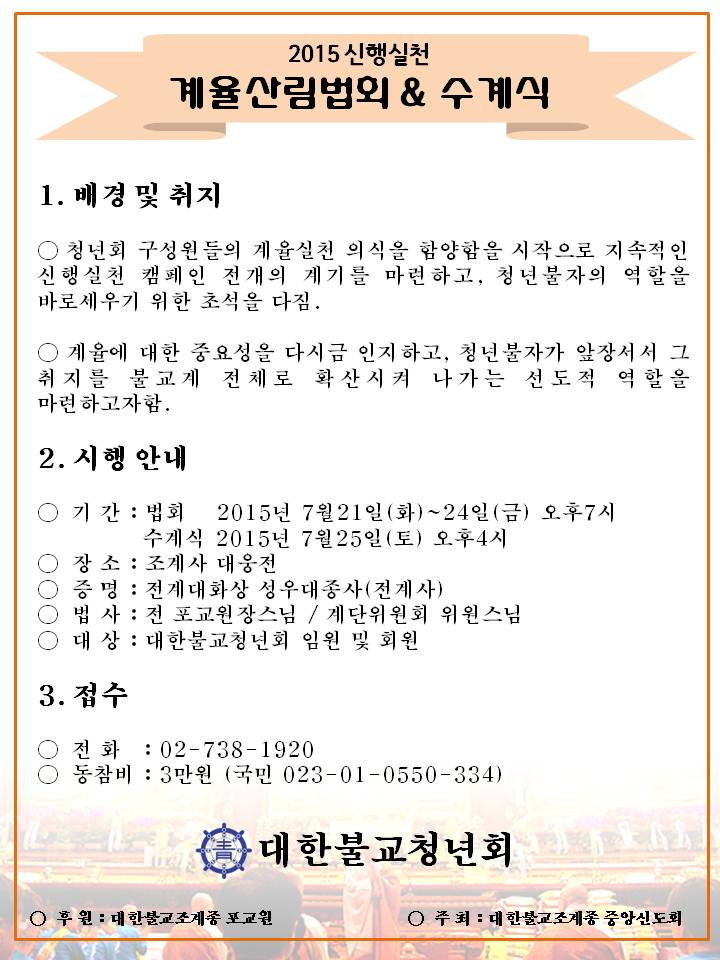 2015 신행실천 계율산림법회 및 수계식 안내 페이지 정보 작성자 중앙사무국 작성일15-07-08 14:03 조회5,682회 댓글0건 본문 댓글목록 등록된 댓글이 없습니다. 이전글 다음글 목록