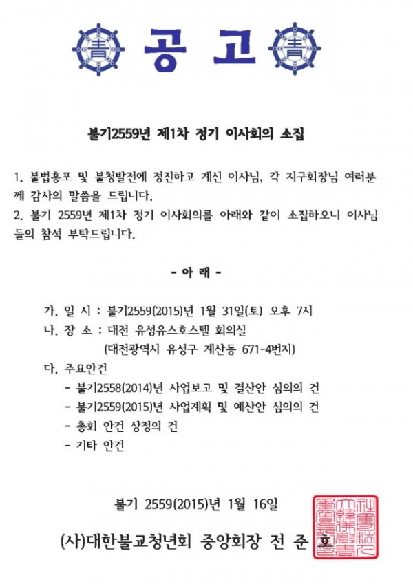 [공고] 2015년 제1차 이사회의 소집 페이지 정보 작성자 대한불교청년회 작성일15-01-16 10:50 조회5,274회 댓글0건 본문 . 댓글목록 등록된 댓글이 없습니다. 이전글 다음글 목록