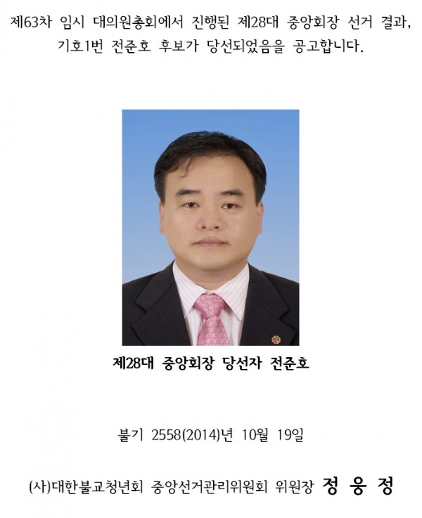 [공고] 제28대 중앙회장 당선 공고 페이지 정보 작성자 선거관리위원회 작성일14-10-19 15:46 조회4,952회 댓글0건 본문 . 댓글목록 등록된 댓글이 없습니다. 이전글 다음글 목록