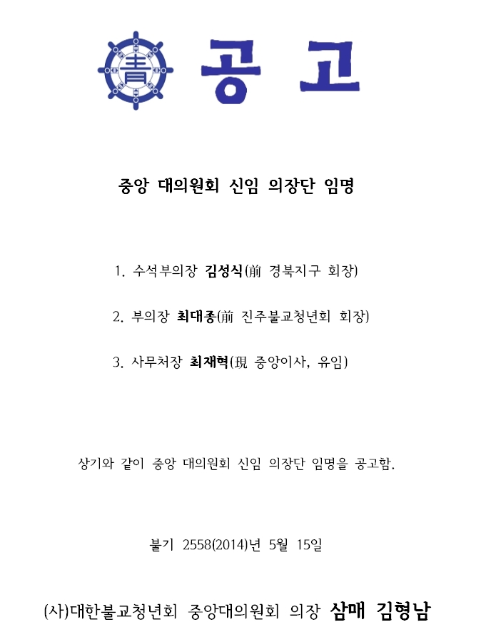 [공고] 중앙 대의원회 신임 의장단 임명 페이지 정보 작성자 중앙대의원회 작성일14-05-15 10:44 조회5,854회 댓글0건 본문 . 댓글목록 등록된 댓글이 없습니다. 이전글 다음글 목록