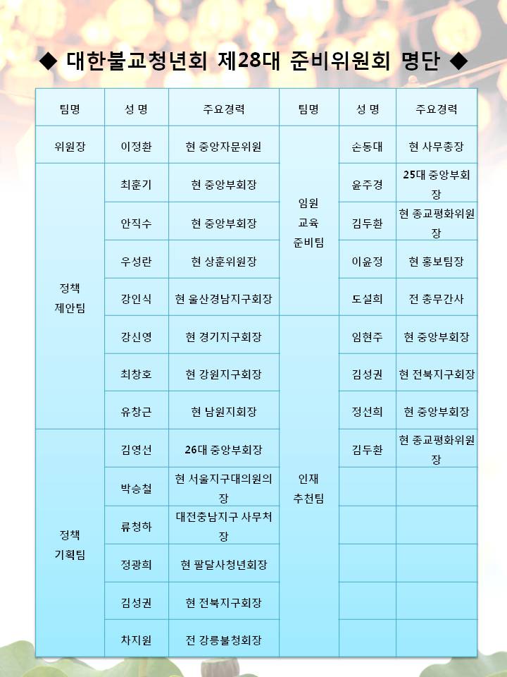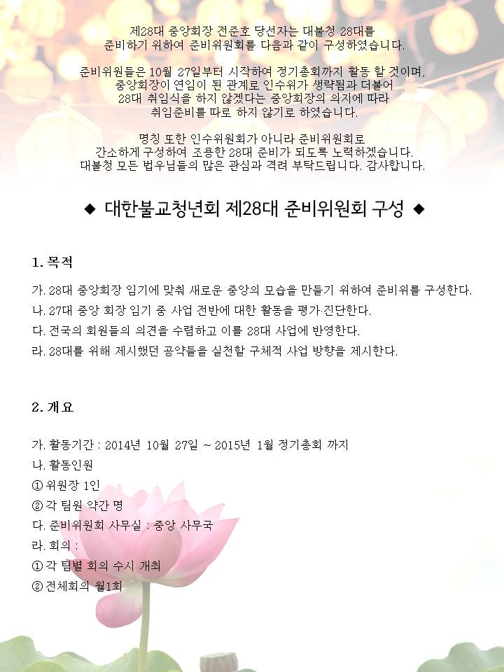 대한불교청년회 제 28대 준비위원회 구성 페이지 정보 작성자 중앙사무국 작성일14-10-27 14:17 조회5,329회 댓글0건 본문 댓글목록 등록된 댓글이 없습니다. 이전글 다음글 목록
