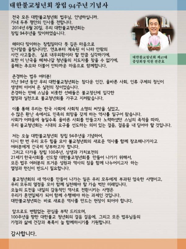 대한불교청년회 창립 94주년 기념사 페이지 정보 작성자 중앙사무국 작성일14-06-20 13:52 조회6,183회 댓글0건 본문 댓글목록 등록된 댓글이 없습니다. 이전글 다음글 목록