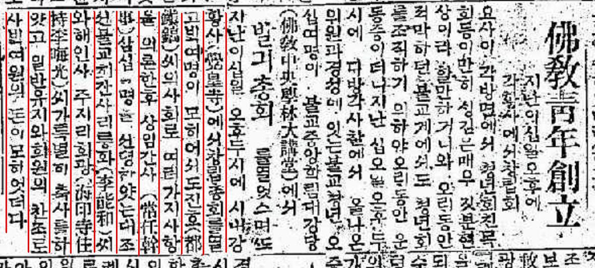 1920년 6월 22일자 동아일보에 "1920년 6월 20일 각황사(현 조계사)에서 조선불교청년회(대한불교청년회 전신)의 창립총회가 열렸다"는 기사가 실렸었습니다.