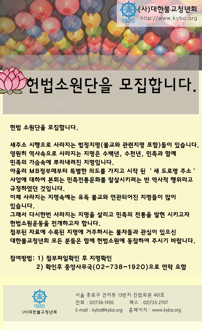 [헌법소원단 모집] 도로명주소 시행에 따라 사라지는 법정지명(불교관련 지명 포함)과 관련한 헌법소원단을 모집합니다.