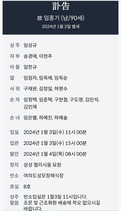 故임성규님께서 별세하셨기에 아래와 같이 부고를 전해 드립니다