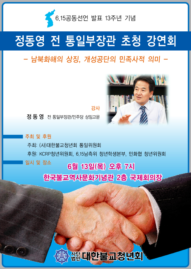 대한불교청년회 통일위원회에서 6.15공동선언 발표 13주년을 맞아 기념 강연회를 준비했습니다.