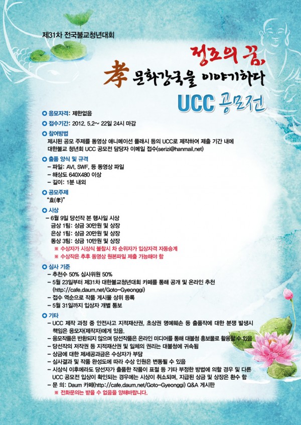 * 문의 : 대한불교청년회 사무국 (02-738-1920) 및 중앙연수원장 (무구 김정희 010-5265-2361)