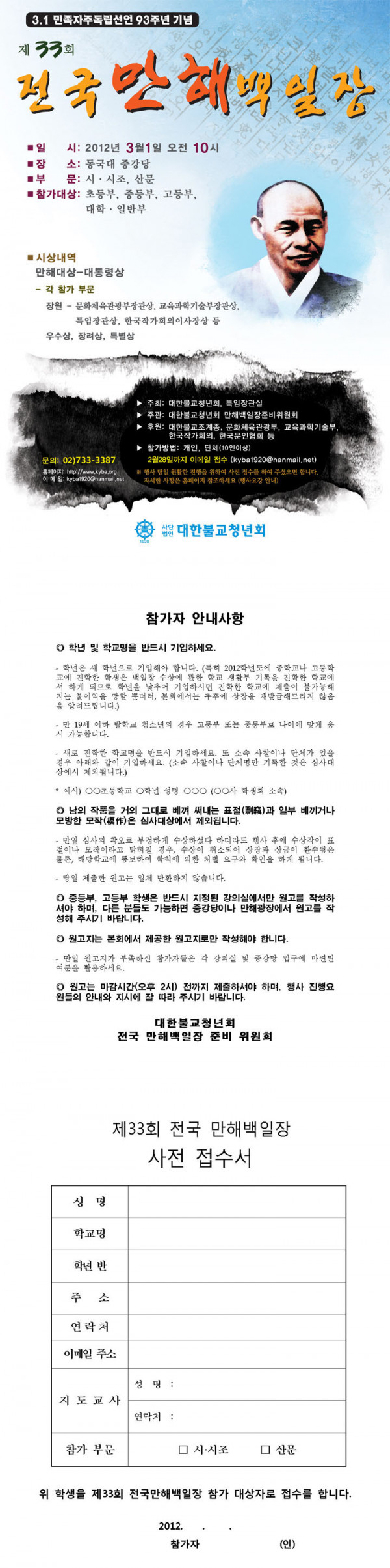 (안내) 제33회 전국만해백일장 응시자 안내사항 및 접수신청서