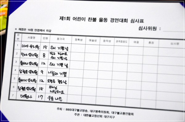 대한불교청년회 대구지구가 주관하고 부처님 오신날 대구봉축위원회 , BBS 대구 불교방송 주최한 제 1회 어린이 찬불 율동 경연대회 (5.1 대구 수성구 청소년 수련관) 관련 자료입니다.
