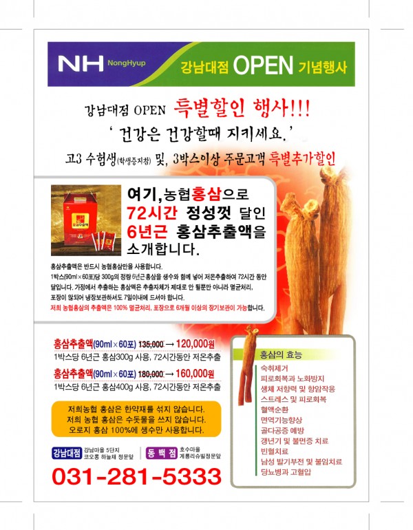평소 여러분의 보살핌에 힘입어 이번에 제가 농협홍삼전문 매장을 개업 합니다.