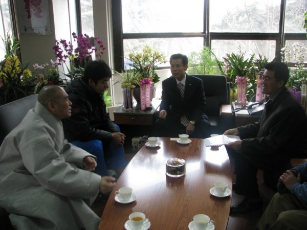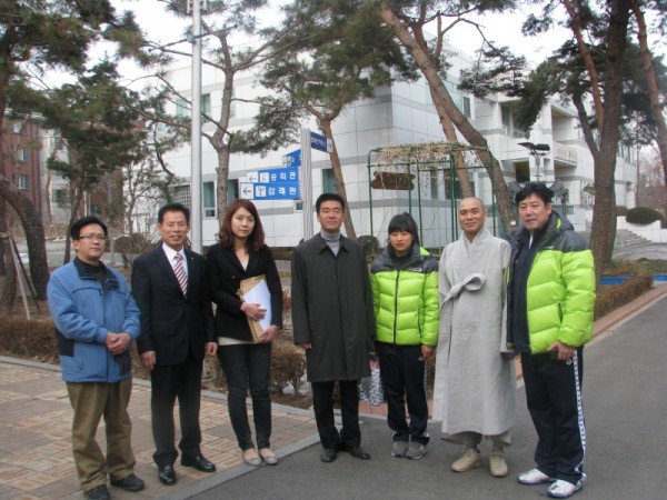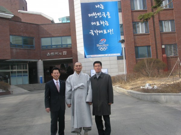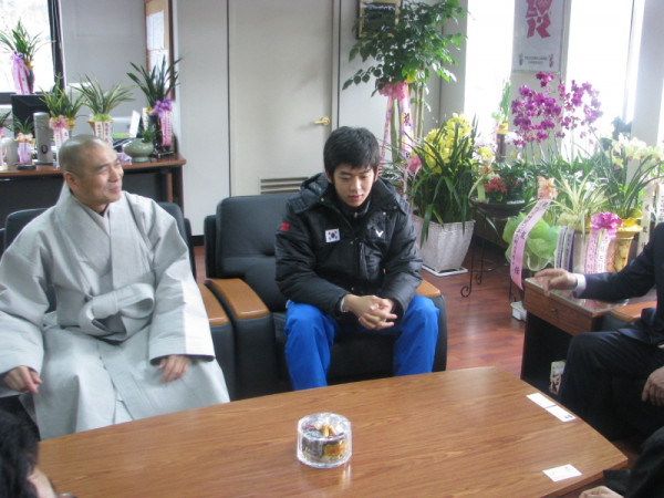 (좌: 첫번째:퇴휴스님 두번째:배드민턴 국가대표 이용대선수 우:대한불교청년회 중화 정우식 회장 가운데:태릉선수촌 박종길 촌장)