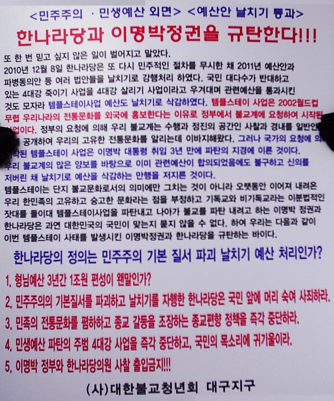 [긴급 성명]예산안 날치기 통과와 관련한 대한불교청년회의 입장