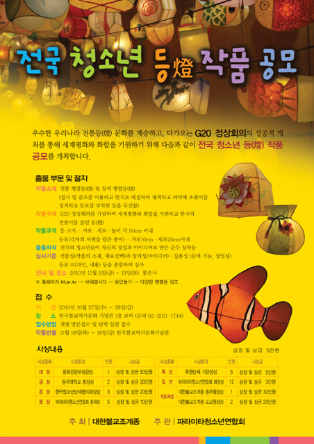 우수한 우리나라 전통등 문화를 계승하고, 다가오는 G20 정상회의의 성공적 개최를 통해 세계평화와 화합을 기원하기 위해 다음과 같이 전국 청소년 등(燈) 작품 공모를 개최합니다.