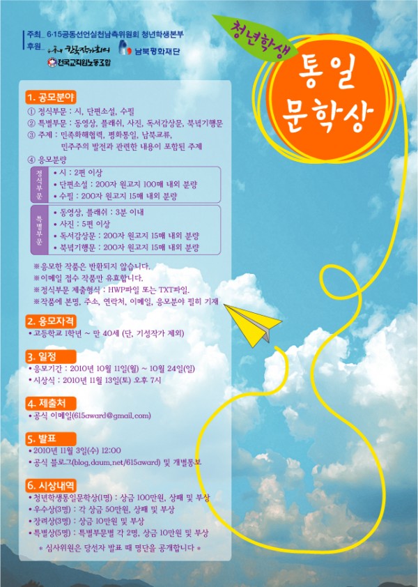 [안내] 통일문학상 공모 페이지 정보 작성자 이경민 작성일10-08-20 11:15 조회5,879회 댓글0건 본문 6.15청년학생본부에서 통일문학상 공모전을 합니다. 많은 관심과 참여 부탁드립니다.[자세한 내용 보기] ☜클릭... 댓글목록 등록된 댓글이 없습니다. 이전글 다음글 목록