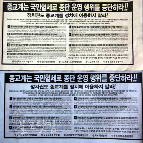 기독교계는 지난 14일자 <문화일보> 39면에 이어 15일자 <경향신문> 10면에 '종교계는 국민혈세로 종단 운영 행위를 중단하라"라는 제목의 5단통 광고를 잇따라 냈다.