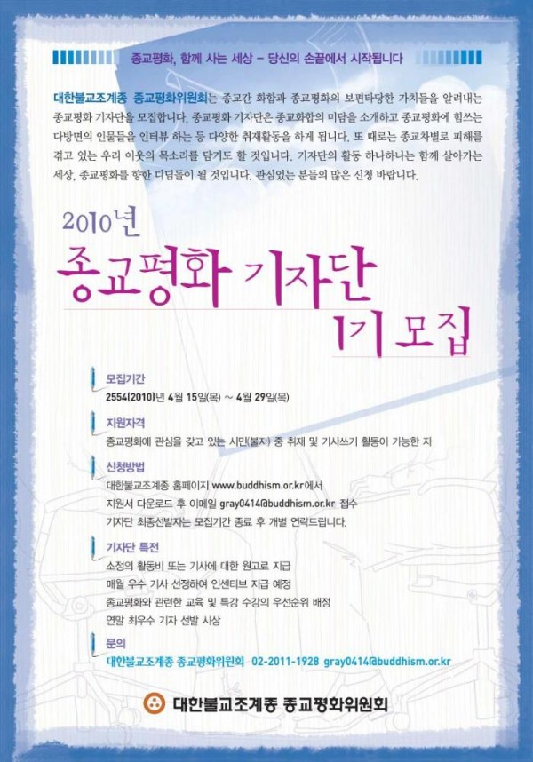 대한불교 조계종에서는 아래와 같이 종교평화 기자단 모집을 하고 있습니다.