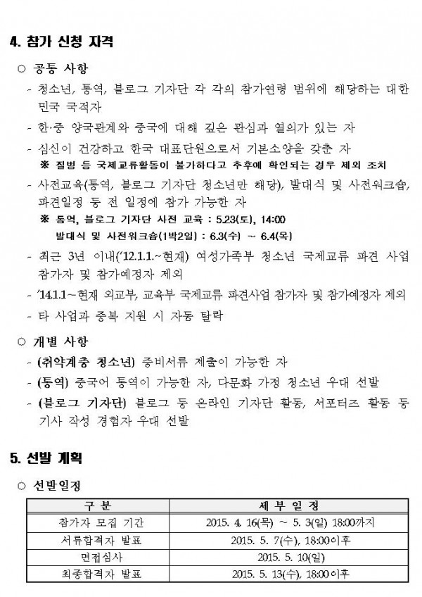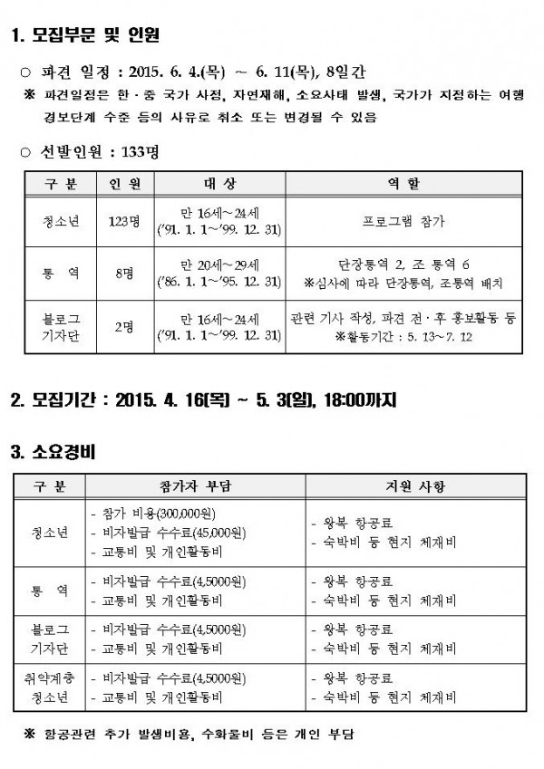 " 2015년 한중 청소년교류 1차 파견" 대표단으로 참가할 청소년(통역요원, 블로그기자단포함) 을 다음과 같이 모집하오니 관심있는 청소년 지도자들의 많은 참여 부탁드리며 자세한 내용은 첨부를 확인바랍니다.