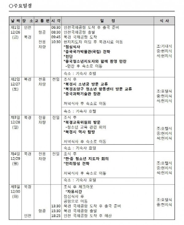 북경 자치별 교육위원회와의 사전 협의에 의해 한중 청소년 지도자 교류를 활성화 하기 위한