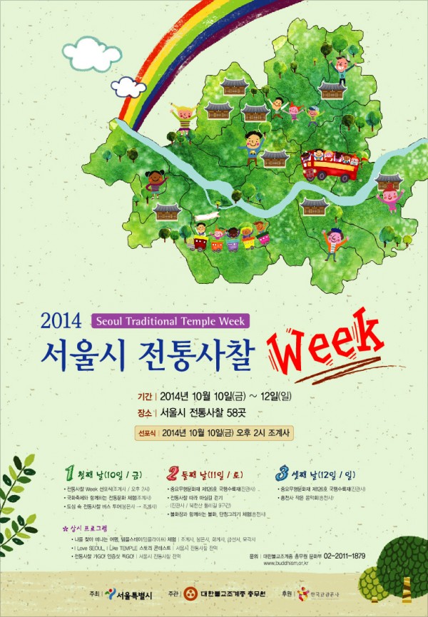 서울시가 주최하고 대한불교조계종 총무원/한국불교태고종/대한불교관음종/대한불교보문종이이 공동주관하는 2014 서울시 전통사찰 Week가 10월 10일(금) 오후2시 조계사에서의 선포식을 시작으로 12일(일)까지 3일동안 서울시 전통사찰 58곳 전역에서 열립니다!