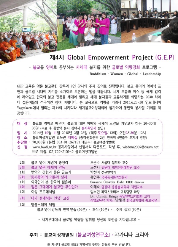 Global Empowerment Project는 불교를 영어로 공부하는 차세대 불자를 위한 글로벌 역량강화 프로그램입니다. 20~30대 대학생, 대학원생, 직장인들이 함께 모여 불교를 영어로 공부하고, 흥미로운 주제의 실전 연습으로 역량을 키운 뒤, 국제 대회(세계불교여성대회)에 참가하여 세계 불자들과 교류하며 통번역 자원봉사에도 참여하는 등 "당신의 인생에 새롭고 재미있는 경험과 성장의 기회를 제공해 줄 것입니다!" 수료 후 통번역 봉사 참여시 봉사확인서도 발급됩니다. 당신의 도전을 응원합니다. 망설이지 마시고 적극 신청해 주셔요 ^^