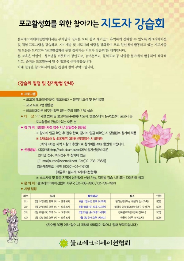 본회에서는 포교활동의 활성화와 각 지역의 지도자분들의 요청으로 2013년 찾아가는 지도자 강습회를 개최하였습니다. 2014년에는 지역을 확대하고, 레크리에이션을 실제로 배워 활용하실 수 있도록 준비하여 “포교활성화를 위한 찾아가는 지도자 강습회”로 개최하오니 지도자 여러분들의 많은 관심과 참석을 부탁드립니다.