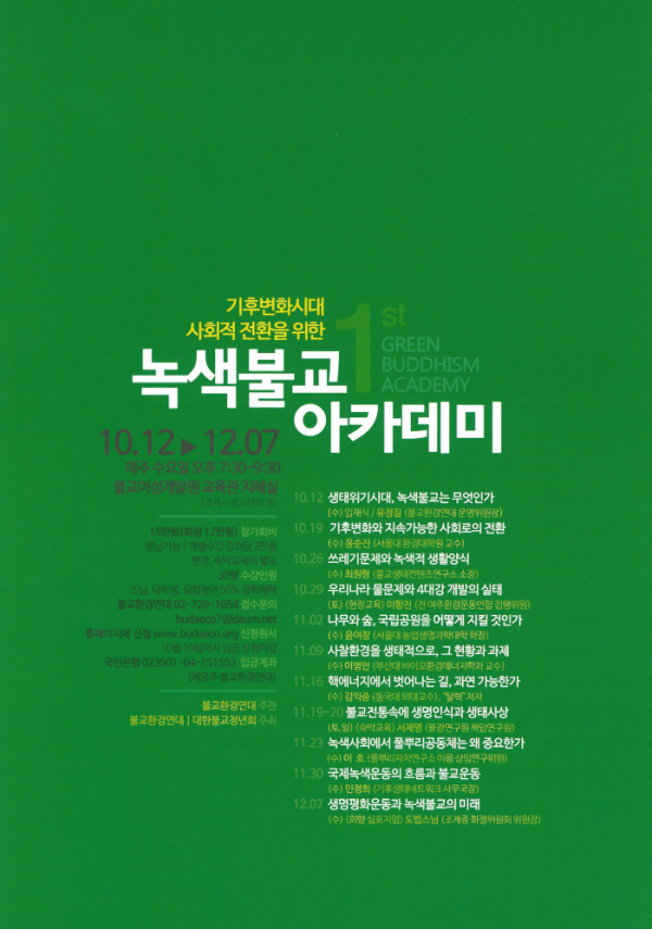 이에 대한불교청년회는 불교환경연대와 함께 녹색불교아카데미를 시작합니다.
