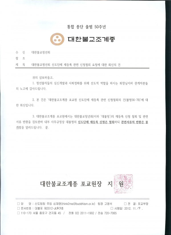 2012년 11월 19일에 조계종 포교원으로부터 접수된 신도단체 재등록 철회관련 회신 공문 입니다. 참조 바랍니다.