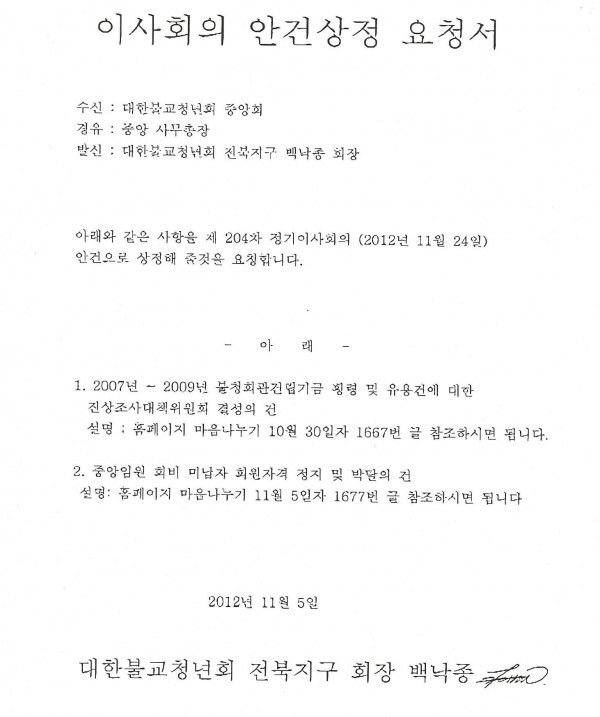 강구하여서 소중한 불청 회관건립 기금의 유용을 막고자 한다.
