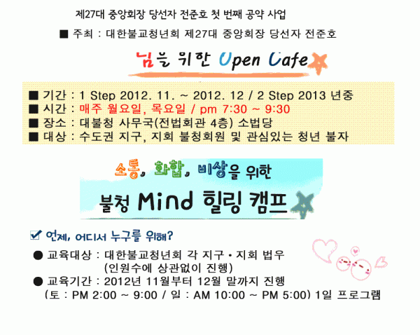 대한불교청년회 27대 중앙회장 당선자 전준호 첫 번째 공약사업 불청 Mind 힐링캠프. 님을 위한 Open Cafe 에 관하여 중앙사무국에서 알려 드립니다.